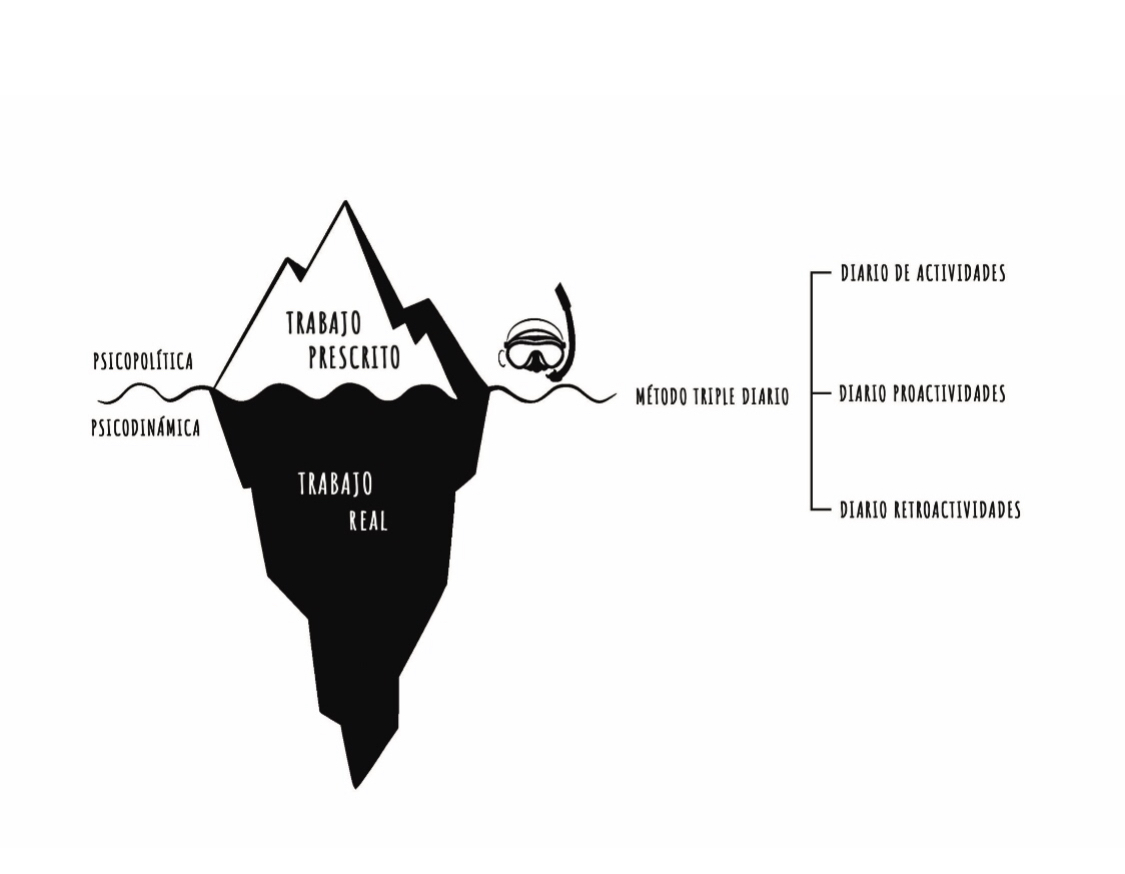 La punta representa el trabajo prescrito, los procesos y procedimientos (psicopolítica). La parte sumergida del iceberg representa el trabajo real, la parte «no escrita», intuitiva, experiencial, cooperativa, a veces informal.